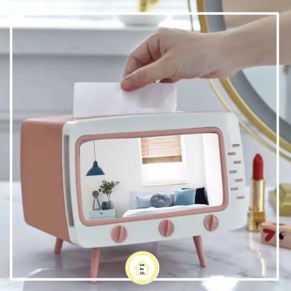 Tissue Box Estetik Bentuk TV Tempat Tisu + Stand Phone Holder / dekorasi kamar rumahProduk ini didesain secara khusus bernuansa retro dan vintage yang membuat produk ini terlihat elegan namun unik untuk menambah kesan estetika ketika dipajang di tempat anda. Namun selain hanya dipajang, produk ini dapat digunakan sebagai tempat menaruh Hp yang membuat anda seperti memiliki TV portable beserta tempat tissue dalam satu kemasan.Kotak Tissue Model TV dengan Holder HP Kotak Tissue Unik bisa buat taruk HP sambil Nonton di ruang tamu ataupun sambil masak di Dapur - Bisa buat di ruang tamu - Bisa buat di dapur- Bisa buat di Kamar Mandi - Produk ini dapat memuat hampir seluruh tipe Hp namun ukuran maximum hp yang dapat digunakan adalah 16cm x 8 cm x 1,5 cmReady 4 Macam Kotak Tissue 1. Biru2. Pink3. Putih4. ToscaMaterial: PP + ABSUkuran Produk 18.5*14.5*16cmBerat: 500gr#Tempattisu #Kotaktisu #Tisurestoran #TisuruangTamu #DekorasiRumah #dekorasikamarestetikSelamat datang di Madaco Store :) Kami menyediakan berbagai macam barang kekinian dan aesthetic Barang yang kami jual dijamin terjangkau dan berkualitas Jangan ragu untuk memberikan bintang 5 setelah membeli karena penilaian dari anda sangat berarti bagi kami Mohon buat Video Unboxing saat paket Diterima dan Dibuka karena kami tidak menerima komplainan jika ada barang yang rusak atau salah kirim tanpa Video Unboxing Terimakasih, HAPPY SHOPPING :) - madaco.company@gmai