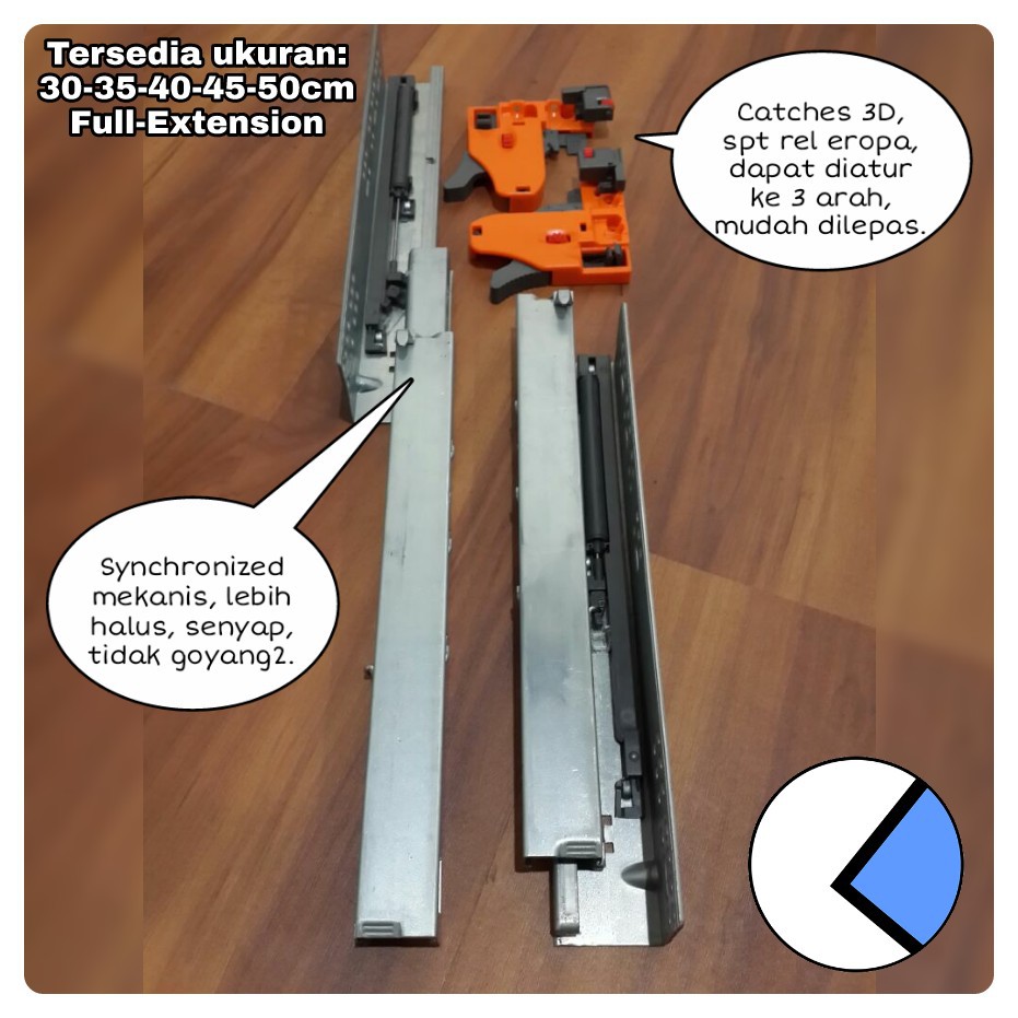 Strumento Rel Tandem Slow Motion E-Class 30cm dengan Catches, Full Extension- Lebar Rel : 4,5cm (makin lebar makin besar kemampuan tahan bebannya)- Panjang Rel : 30cm (riil, tidak dikurangi spt merk lain)- Tebal Plat : 1,2mm kokoh(biasanya di pasaran hanya 0,8mm)- Harga tersebut diatas per pasang (2pc) + 2 Catches (1 kanan, 1 kiri)- Fungsi Catches dapat dilihat di video berikut (https://www.youtube.com/watch?v=8A77YH1WmII)- Catches kami dapat diatur (Naik-turn 3mm, kanan-kiri 1,5mm, maju-mundur 3mm), sangat mempermudah instalasi.- Material campuran Besi, Zinc, dan Alloy yang Sangat tahan karat- Mekanisme Slow Motion terlindungi plastik penutup, tidak mudah macet- Dibelakang rel terpasang damper karet, bila laci dibanting maka bunyi diredam (jarang merk lain ada)- Beban maksimal 40kg (termasuk lacinya)- Tidak termasuk skru